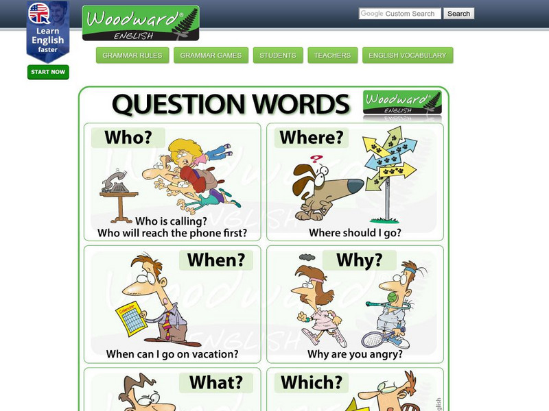 Woodward English: Questions Words uses pictures and words to answer the 5 W's and H questions.