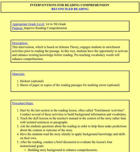 This intervention, which is based on Schema Theory, engages young scholars in enrichment activities prior to reading the passage. In this way, students have the opportunity to activate and enhance existing knowledge before reading....