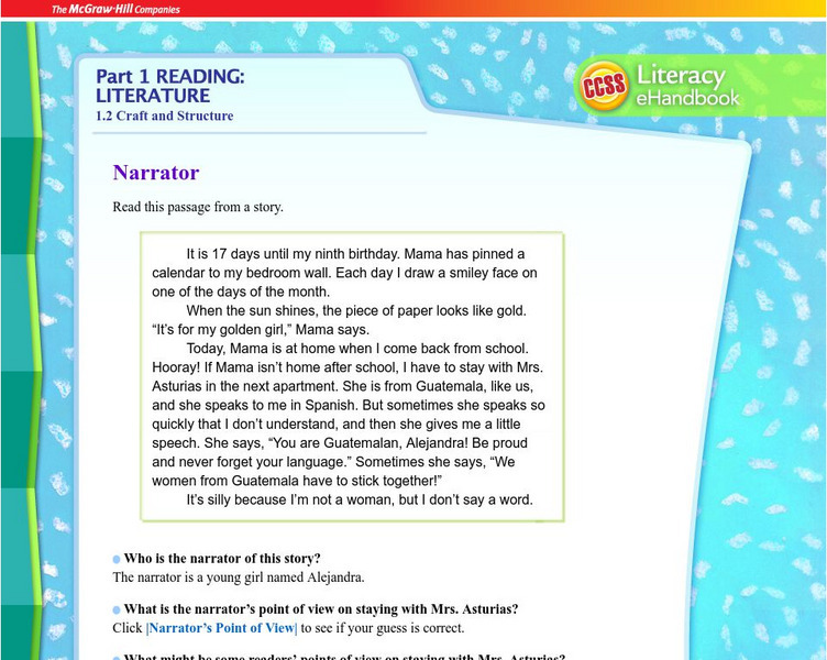 Read a passage from a story to determine who is the narrator and what is the narrator's point of view. An additional practice exercise is available. CCSS.ELA-Literacy.CCRA.R.6