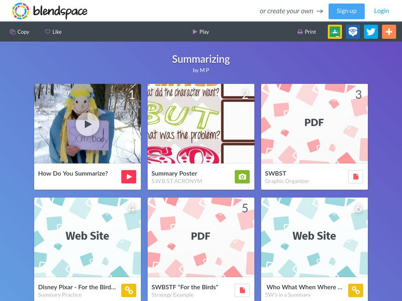 A twelve-part learning module with links to videos, images, websites, and text about summarizing a text.