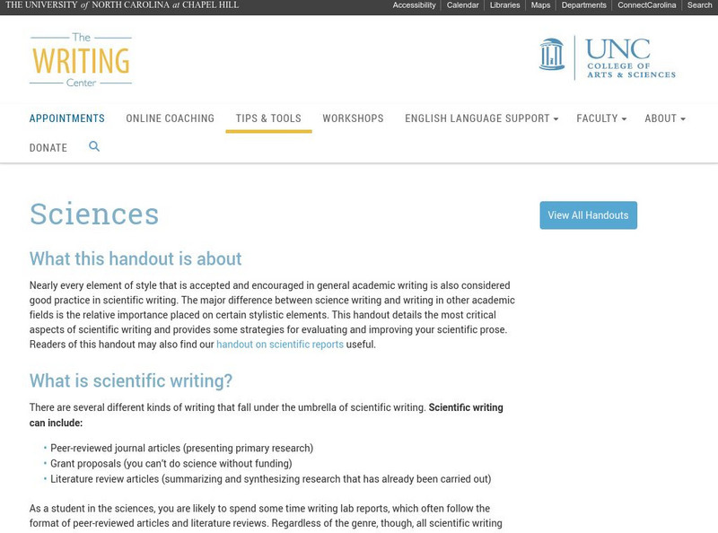University of North Carolina: Writing Center: Handouts: Writing About Science