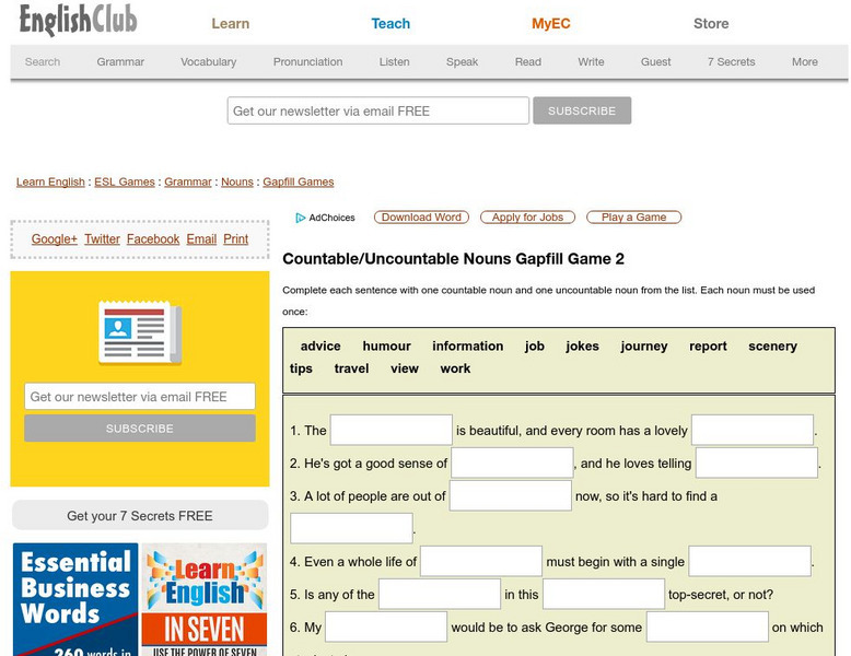 English Club: Countable/uncountable Nouns Gapfill Game 8