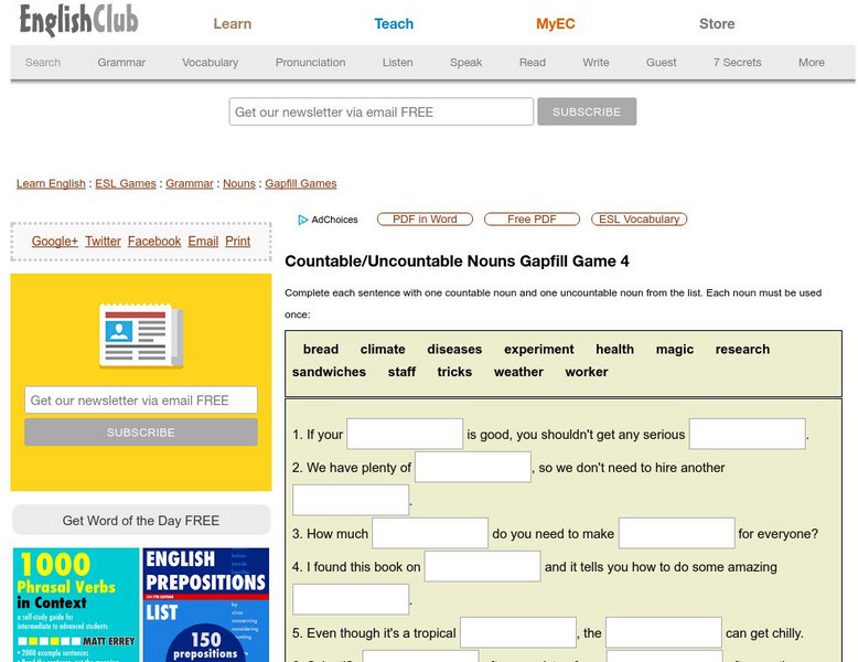 English Club: Countable/uncountable Nouns Gapfill Game 4