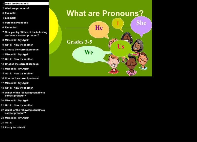 An online slide show defines pronouns and explains their use at this site. A link at the end leads to an interactive quiz which provides immediate feedback and explanations for each answer.