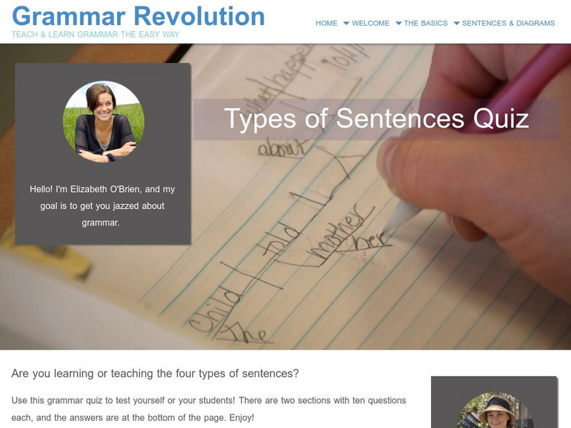 This site offers a brief tutorial on the four types of sentences, then two exercises of 10 sentences each, for student practice or assessment. Answers are also available.