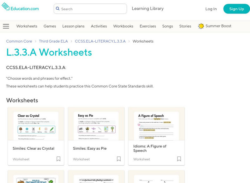 [Free Registration/Login Required] A site with links to 21 worksheets that can be downloaded and printed for student use while building skills with standard L.3.3.A: Choose words and phrases for effect.