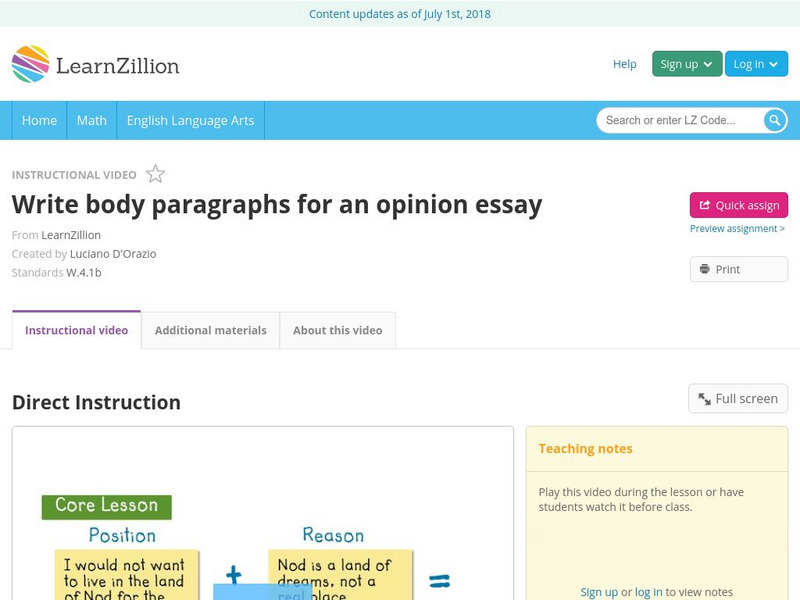 Learn Zillion: Write Body Paragraphs for an Opinion Essay