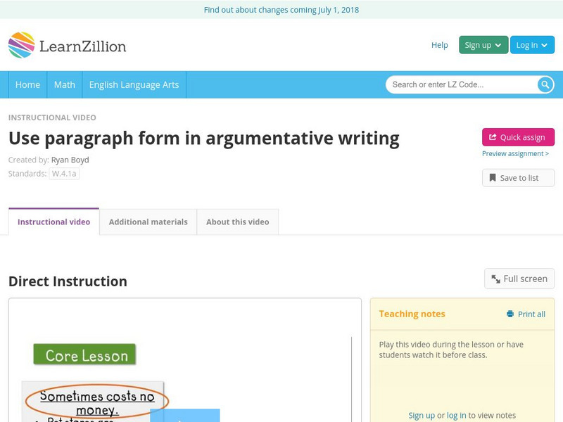 Learn Zillion: Use Paragraph Form in Argumentative Writing