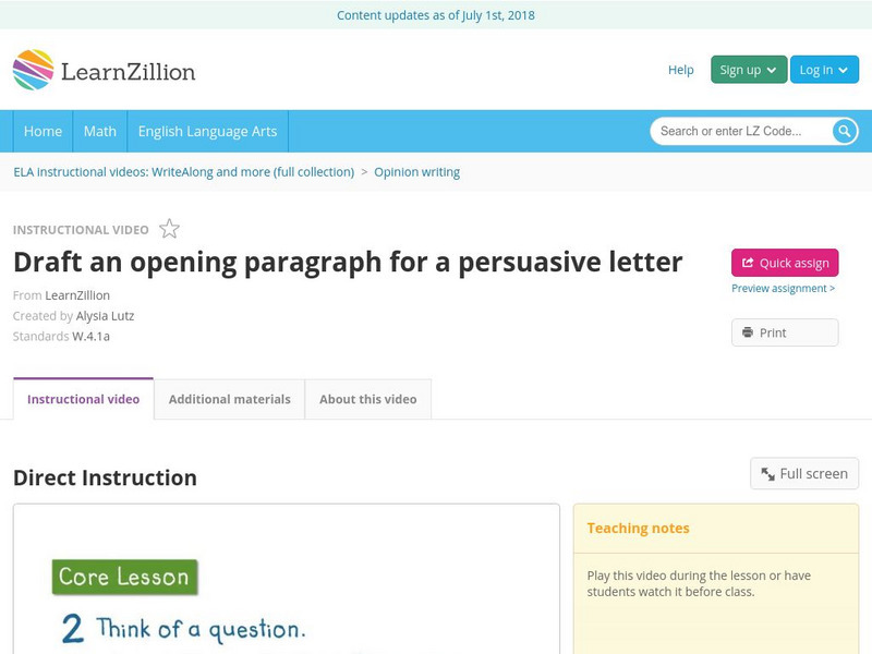 Learn Zillion: Draft an Opening Paragraph for a Persuasive Letter