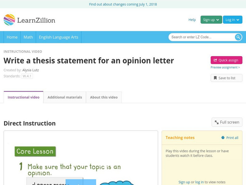 Learn Zillion: Write a Thesis Statement for an Opinion Letter