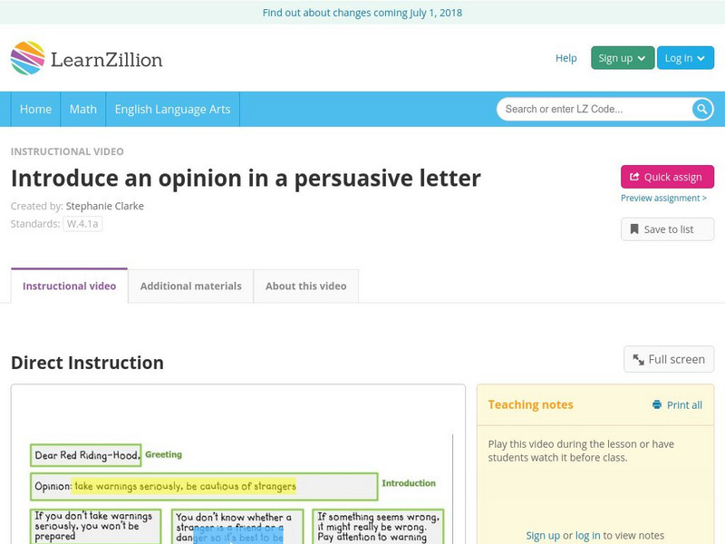 Learn Zillion: Introduce an Opinion in a Persuasive Letter