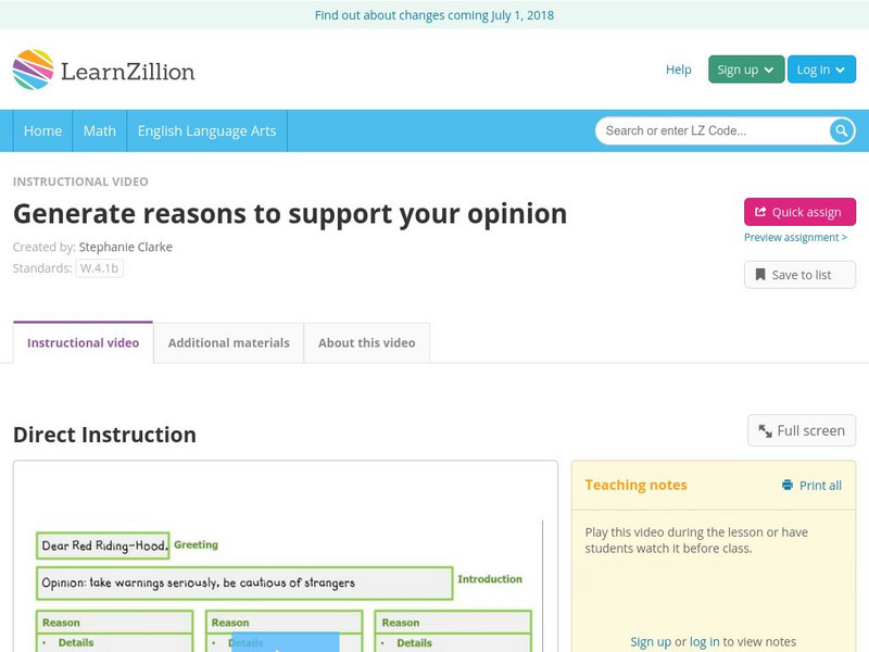 Learn Zillion: Generate Reasons to Support Your Opinion