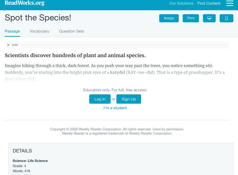 [Free Registration/Login Required] An informational text about several new species of animals found in Papua New Guinea. A question sheet is available to help students build skills in reading comprehension.