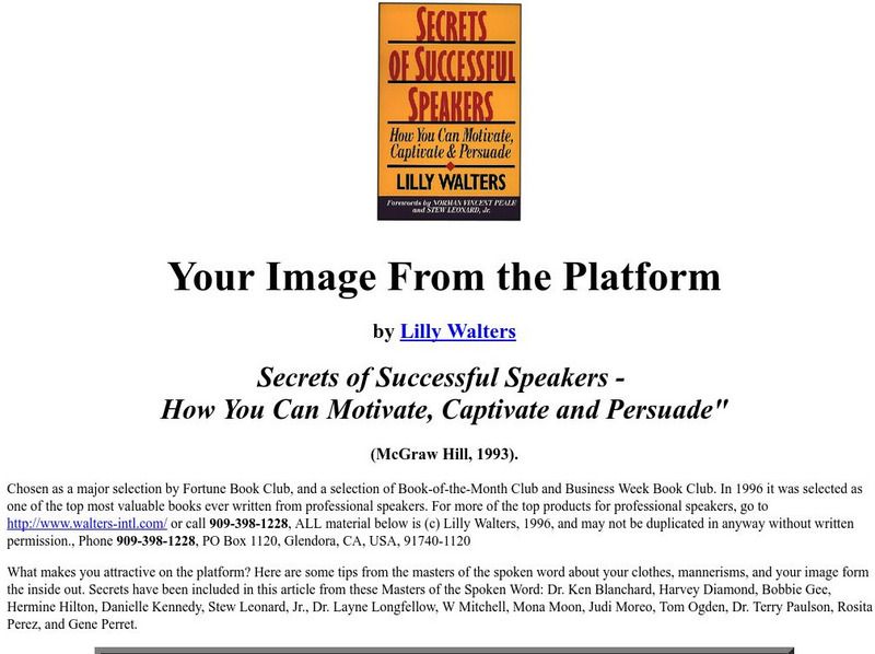 This site relates your image to your presentation. For example, in speeches to inform, you want people to direct their attention to you so that they understand the information you are providing. This site will give suggestions on how to...
