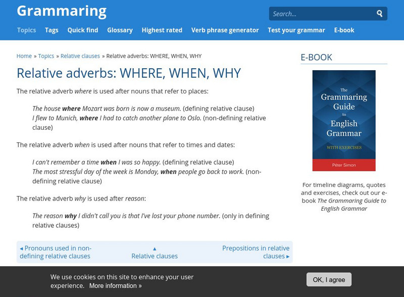 Notes and examples explaining relative adverbs and how they are used in sentences.