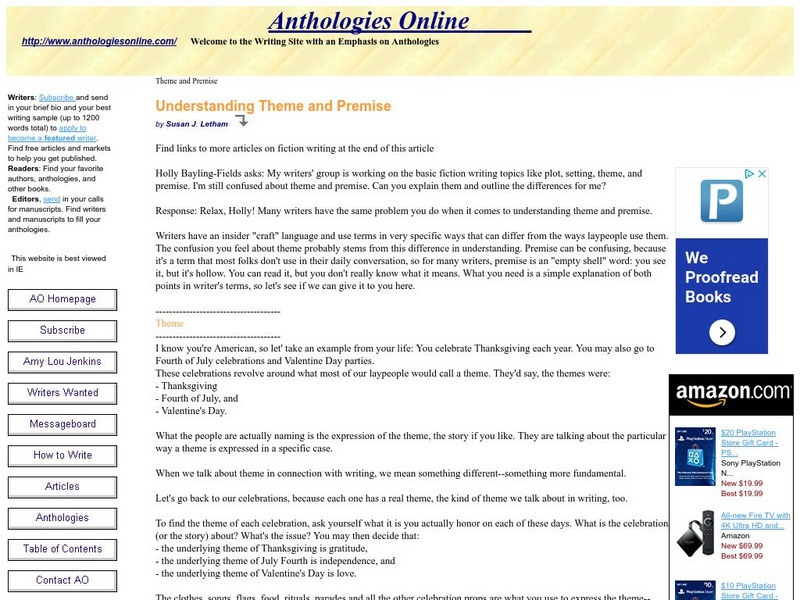 AnthologiesOnline.com provides this article Understanding Theme and Premise by Susan J. Letham, which provides tips on how to develop ideas for writing.