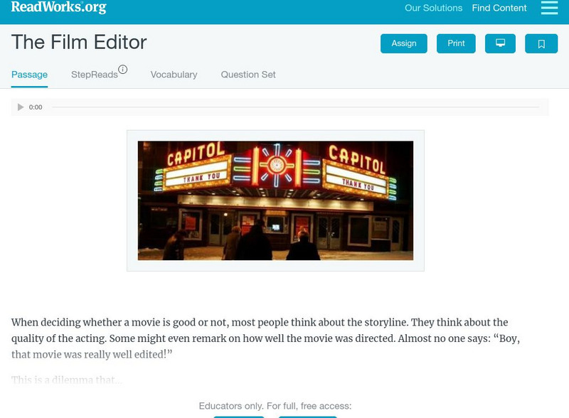 [Free Registration/Login Required] Students read a nonfiction text about the job of a film editor and answer questions about comprehension, supporting details, inferencing, main idea, and more. Links to a paired text and paired text...