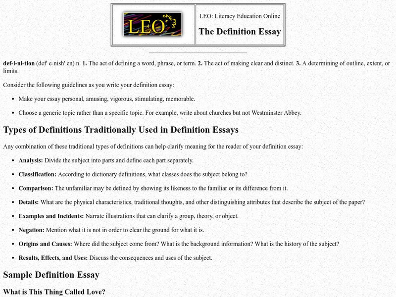 This site provides guidelines for writing definition essays. It also explores various types of definition writing and provides a few short examples.