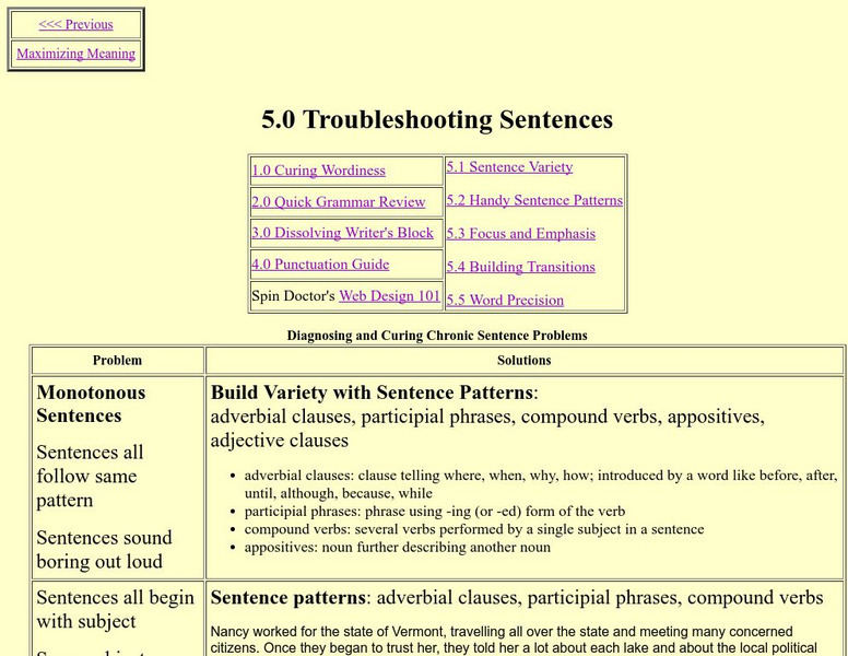 This site presents in chart form a list of common sentence problems with possible solutions offered. A couple additional links are provided for further information.