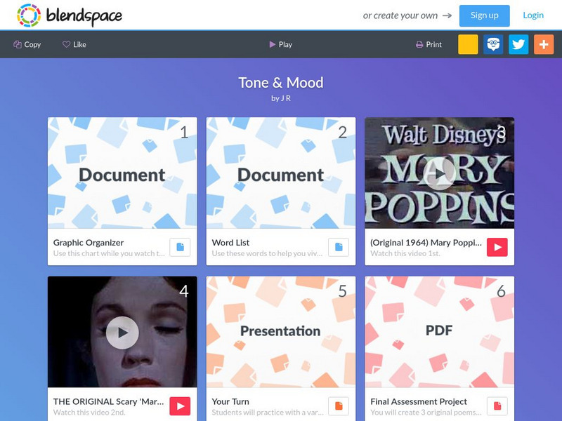 A six-part learning module with links to texts, videos of movie clips, and a slideshow to introduce Tone and Mood.