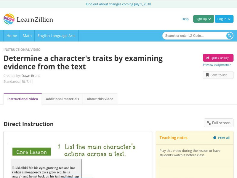 Learn Zillion: Determine a Character's Traits by Examining Evidence From the Text