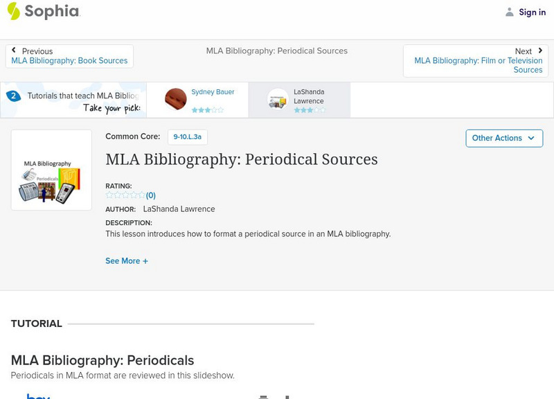 This slide show tutorial shows how to format periodical sources such as newspapers, magazines, and journals in an MLA bibliography. It is 2 of 2 in the series titled "MLA Bibliography: Periodical Sources."