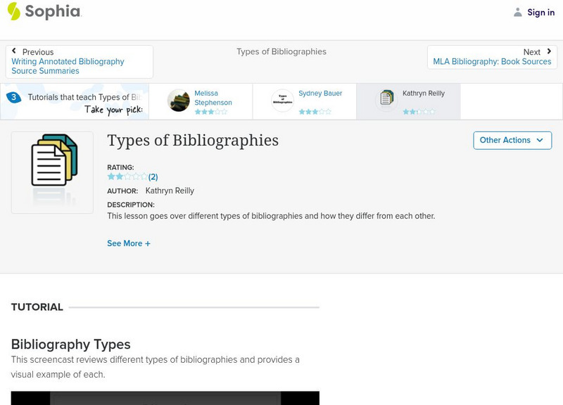 This video lesson focuses on types of bibliographies, their purposes, and similarities and differences. It lists and explains the 4 types of bibliographies: bibliography, annotated bibliography, working bibliography, and Works Cited (MLA...