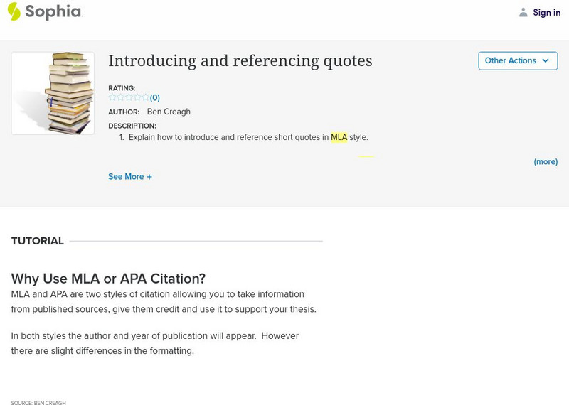This tutorial focuses on introducing and referencing short and long quotations using both MLA and APA style formats. Each style is presented separately using text for information concerning short quotations and a video for long...