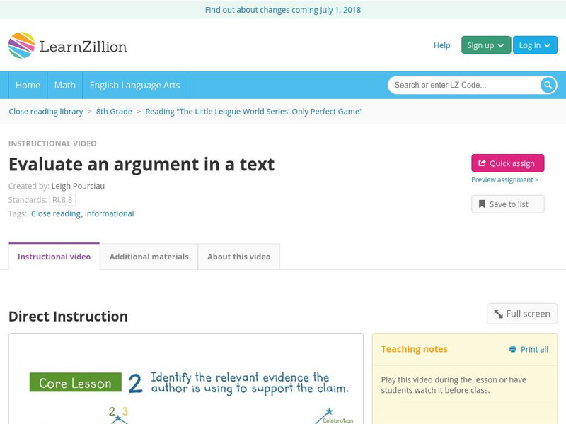 Learn Zillion: Evaluate an Argument in a Text