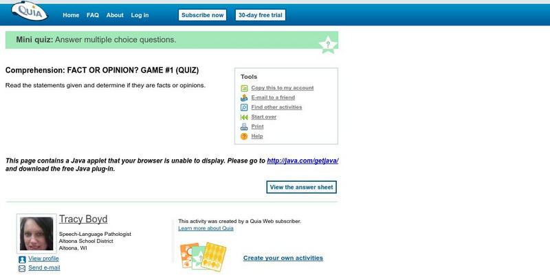 This is a 30 question quiz on separating fact from opinion. Students read the statement and select fact or opinion. Java plugin is required.