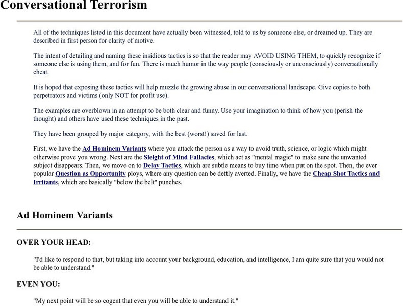 This humorous essay arms you against a host of "conversation terrorist" techniques. Learn to interpret phrases that are meant to keep you quiet, change the subject, or throw you off track in your conversation. SL.9-10.3 Eval...