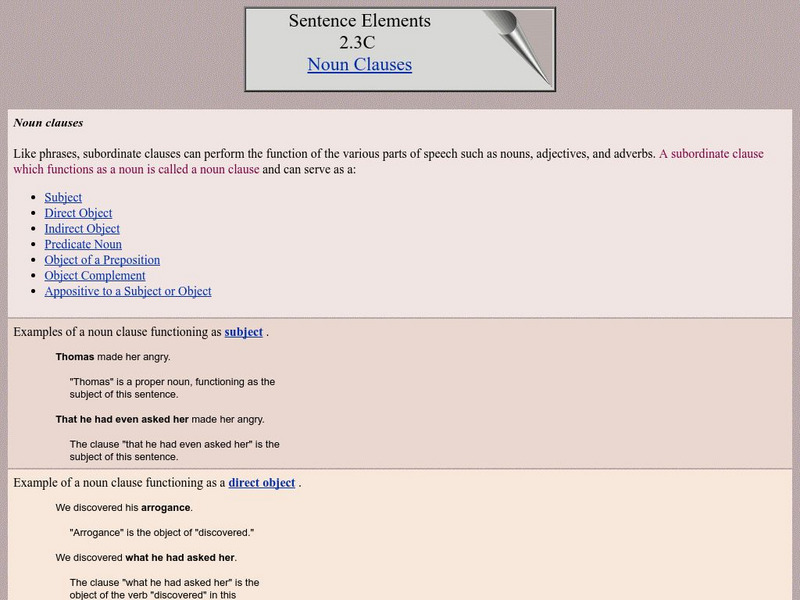 Online grammar textbook explaining sentence structure provides definitions of different types of subordinate clauses and exercises related to this topic. There is also information on phrases and other components of sentences.