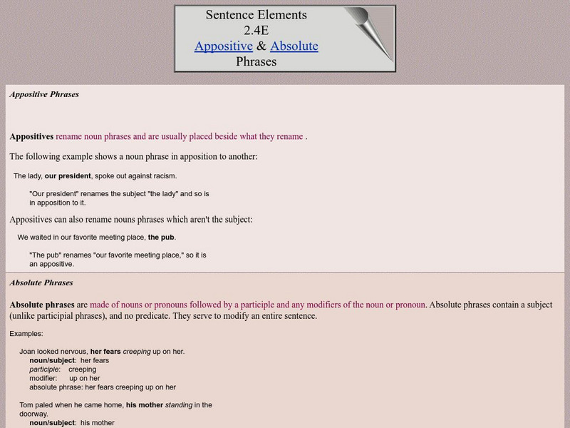This section of an online grammar guide provides definitions, examples, and an interactive exercise on identifying appositive and absolute phrases. L.9-10.1b Phrases/Clauses