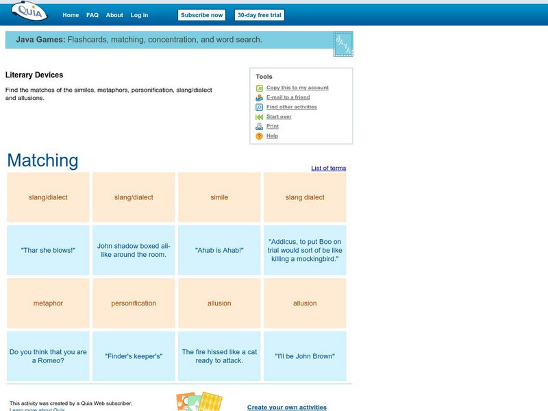 This game asks students to match literary devices (similes, metaphors, personification, slang/dialect and allusions) with their examples while remembering where they are located behind covered squares. Java is required.