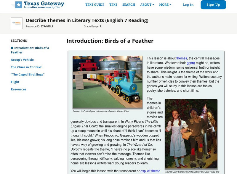 [Accessible by TX Educators. Free Registration/Login Required] This lesson is about themes, the central messages in literature. Whatever their genre might be, writers have some wisdom, some universal truth or insight to share; this...