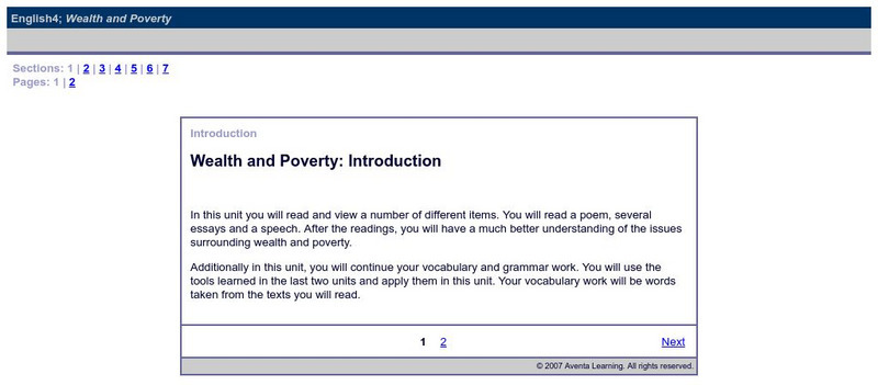 A learning module asking students to analyze different types of texts, learn literary terms, write a satirical essay and a mock newspaper article, and work with vocabulary skills all within themes related to wealth and poverty.