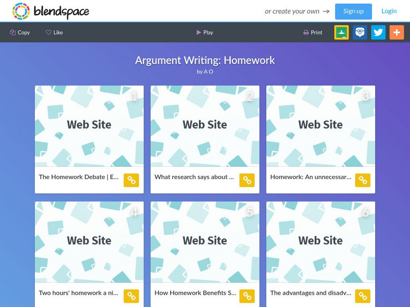 A learning module with links to eight websites to use while writing an argumentative essay on how beneficial homework is.
