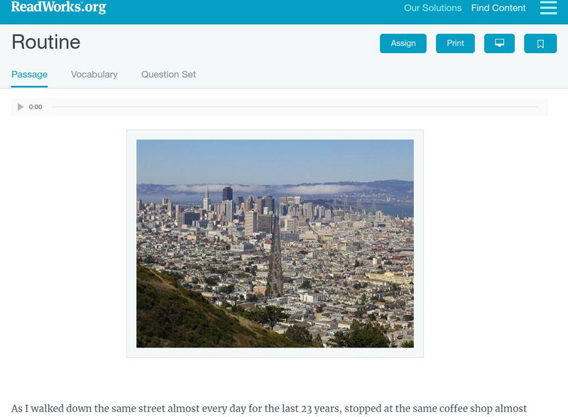 [Free Registration/Login Required] A literary text about a person who becomes tired of the routineness of life. A question sheet is available to help students build skills in reading comprehension.