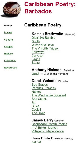 This site features poems by 14 Caribbean poets, including Derek Walcott. It also offers links to information about the Barbados culture. RL.9-10.6 cultural World Lit