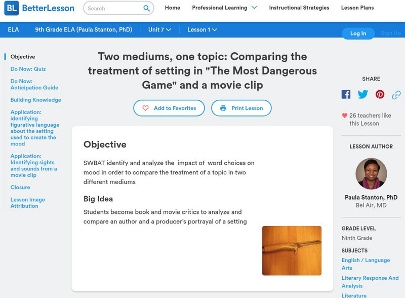 Comparing the treatment of setting in "The Most Dangerous Game" and a movie clip. RL.9-10.7 analyze 2 media