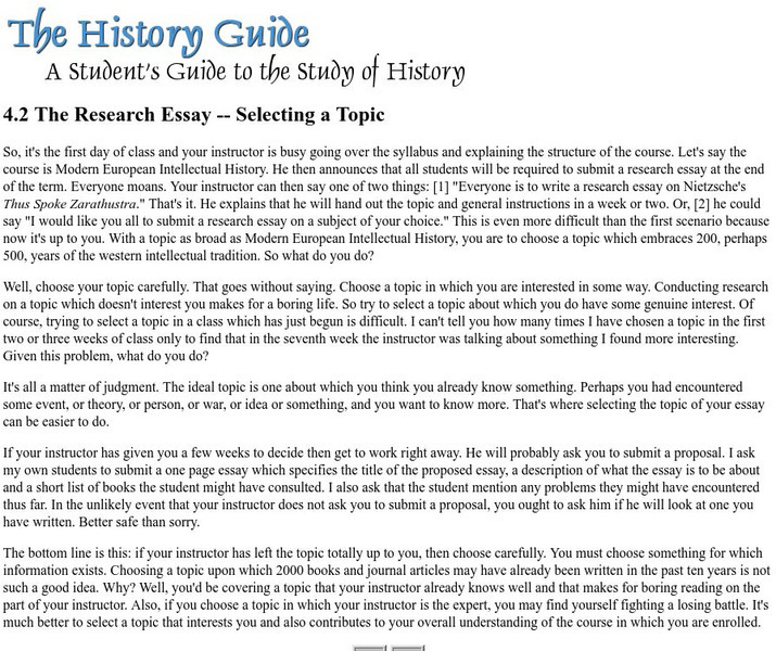 This site provides five links to help students select a topic: The importance of choosing a good topic, your areas of expertise, your areas of interest, brainstorming, and scoping your topic.