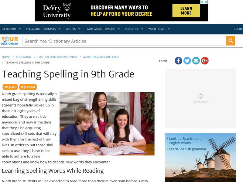 This article focuses on spelling in the ninth grade including acquiring specialized skill sets for life, learning spelling while reading, and the skills to drill: letter sounds, syllables, and rhythm. L.9-10.2 Cap/Punc/Spell