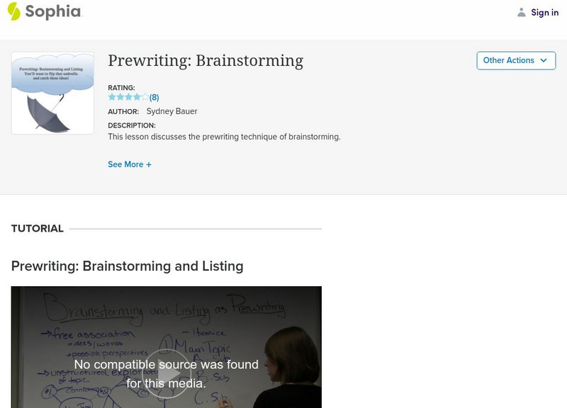 This video lesson focuses on brainstorming and listing as a prewriting activity. It discusses free association of ideas and perspectives, using webs or flow charts of ideas, and a variety of listing methods. Next students should look at...