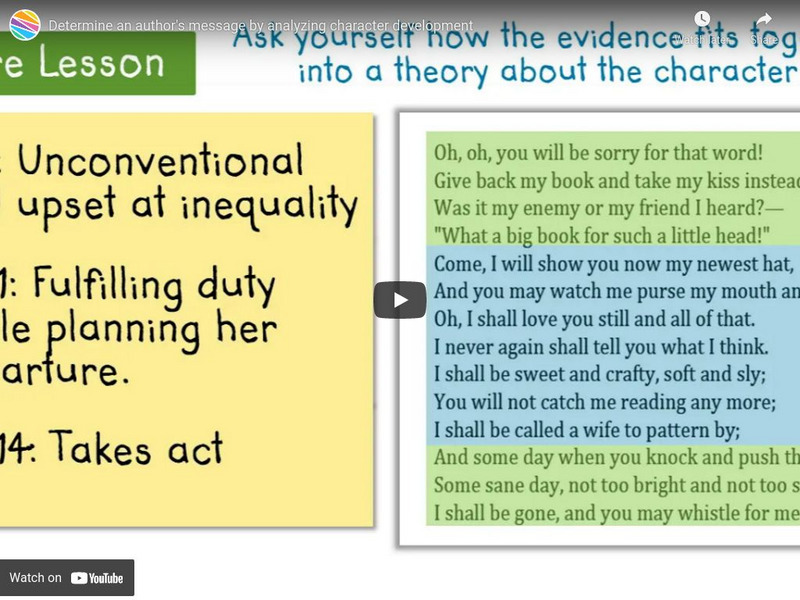 In this video, you will learn how to determine an author's message by analyzing character development. RL.11-12.3 Auth choice story elem [5:56]