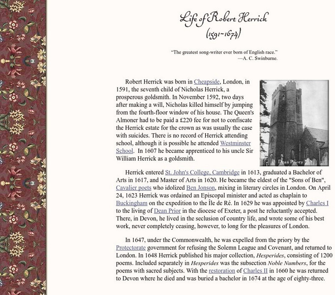Part of the Herrick section of the Luminarium site, this is a concise biography with links to more information.