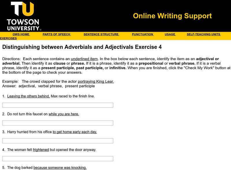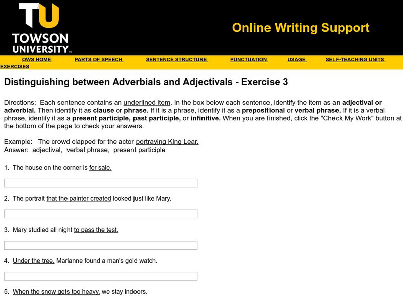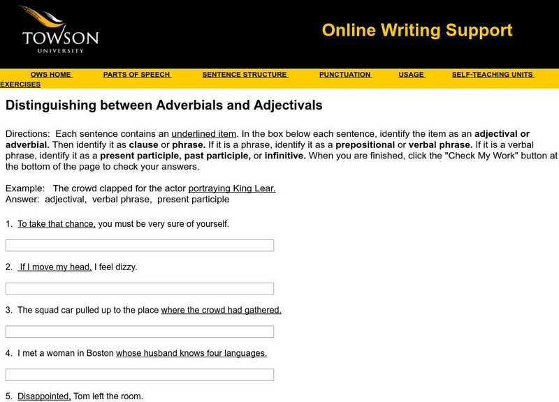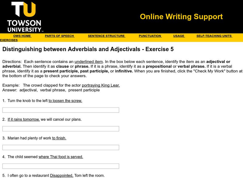 Towson University: Distinguish Between Adverbials and Adjectivals Exercise 3