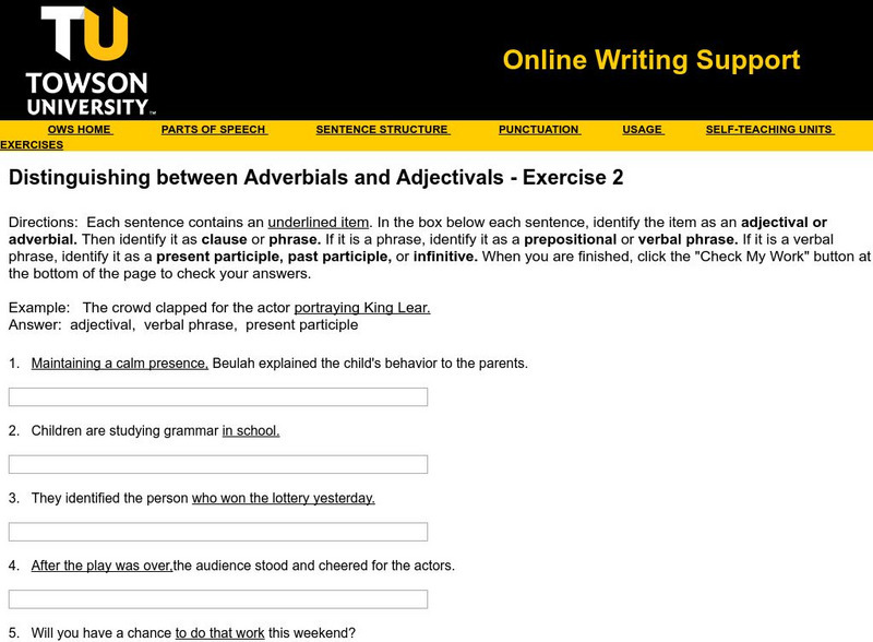 Towson University: Distinguish Between Adverbials and Adjectivals Exercise 2
