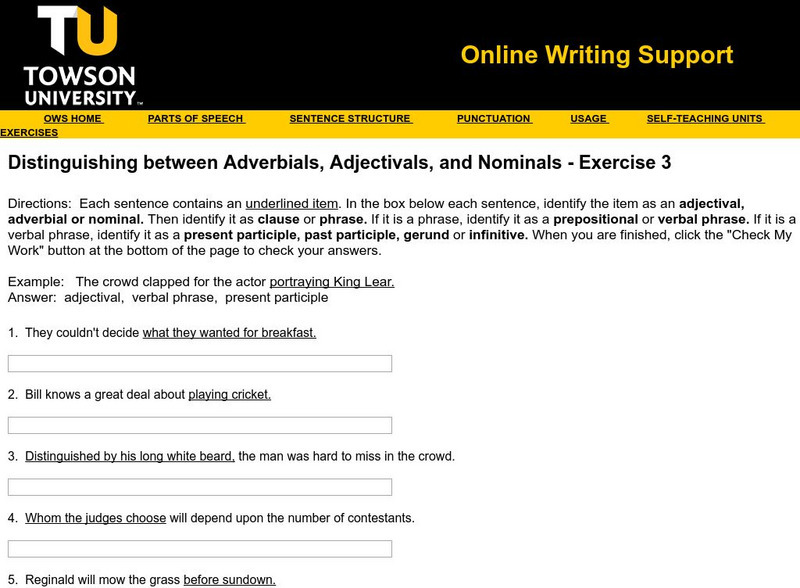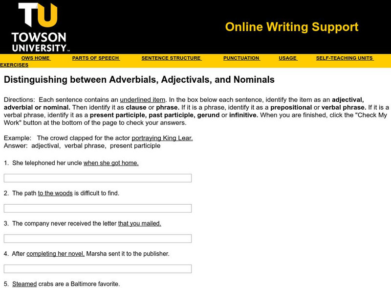 Towson University: Distinguishing Adverbials, Adjectivals, Nominals Exercise 3