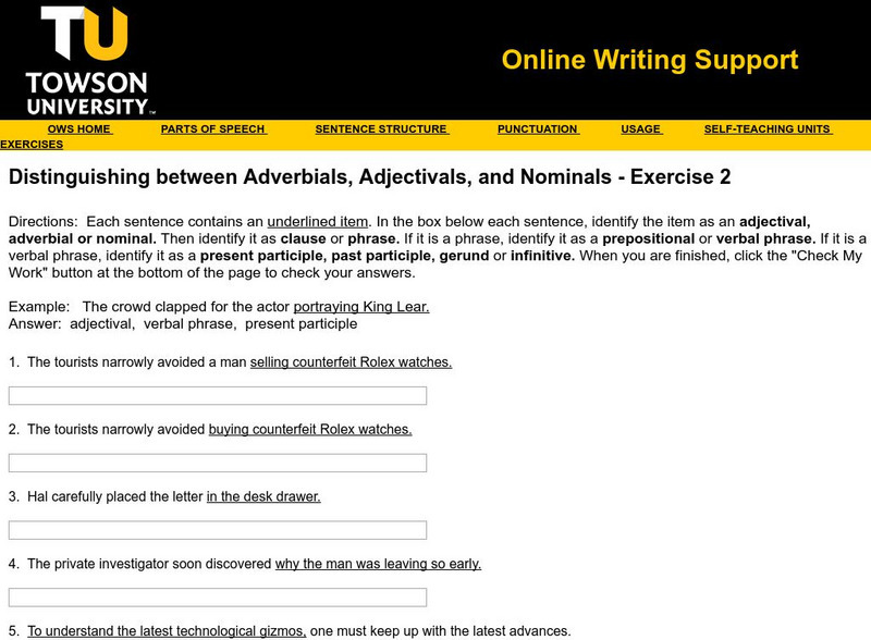 Towson University: Distinguishing Adverbials, Adjectivals, Nominals Exercise 2