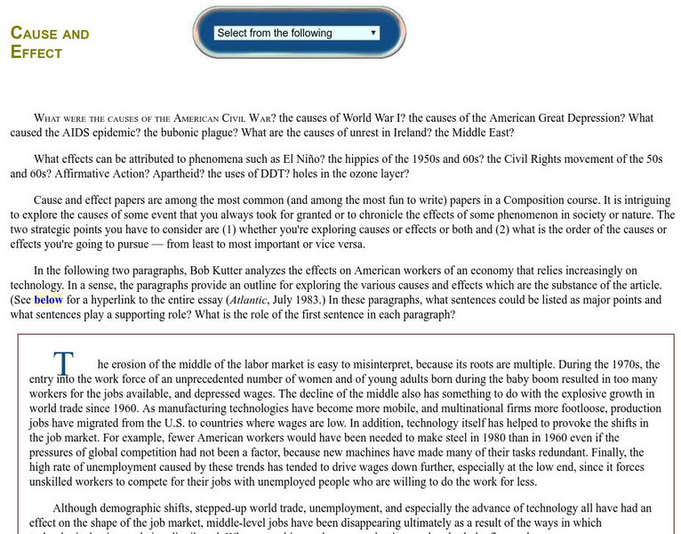 Capital Community College gives excellent overview, assistance, and examples of using cause and effect in writing and composition.